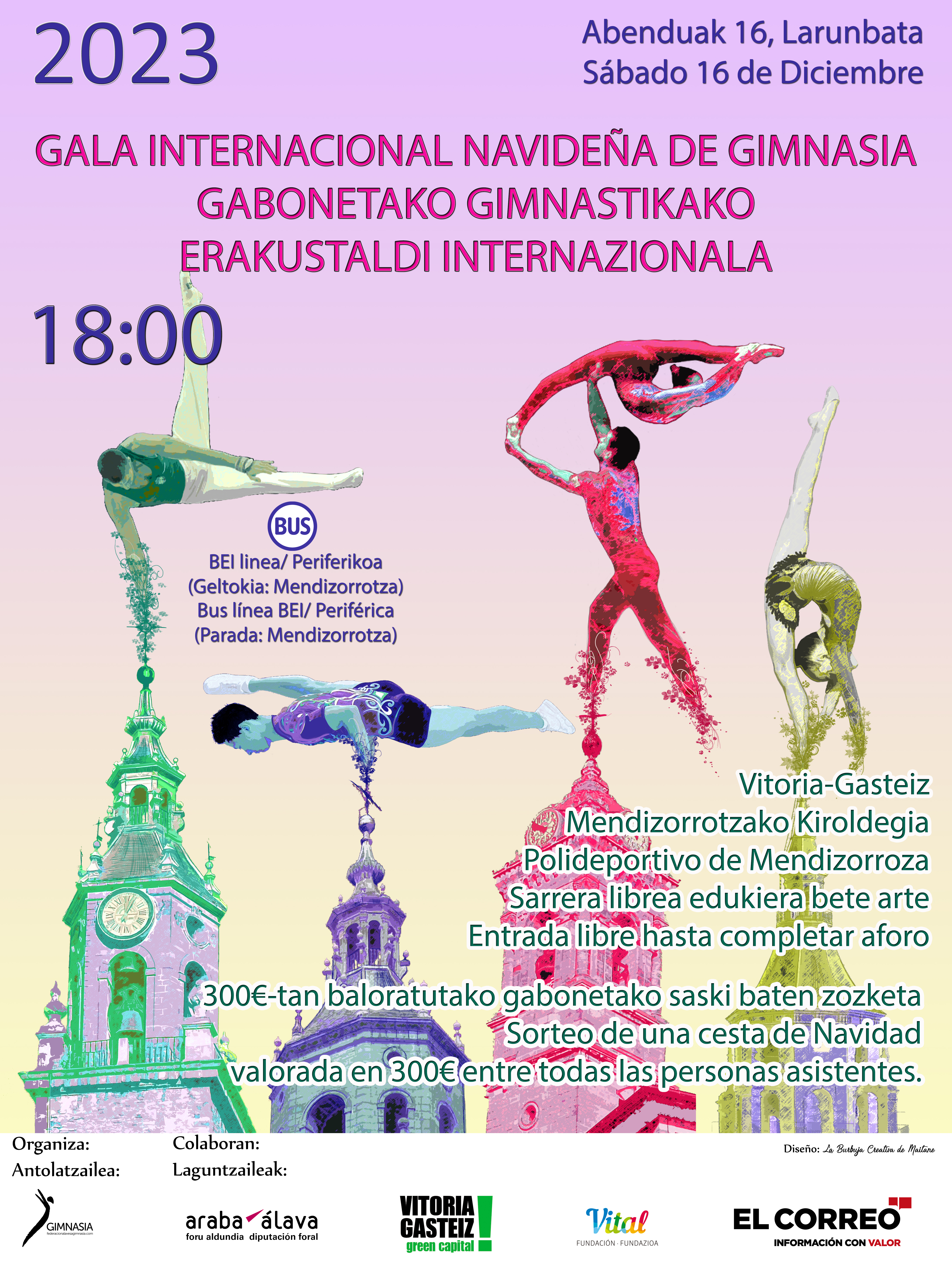 El sábado 16 de diciembre organizamos la tradicional Gala Internacional Navideña de Gimnasia, en el polideportivo de Mendizorroza, en horario de 18:00h a 20:15h. En la misma participan un centenar de gimnastas destacados a nivel internacional, nacional y local, de gimnasia rítmica, aeróbic, artística femenina, artística masculina, parkour y trampolín. Al iniciar la Gala se realiza un desfile de escolares, al que han sido invitadas todas las entidades que practican alguna de las modalidades gimnásticas. El evento está patrocinado por Diputación Foral de Álava, Ayuntamiento de Vitoria-Gasteiz y Fundación Vital.